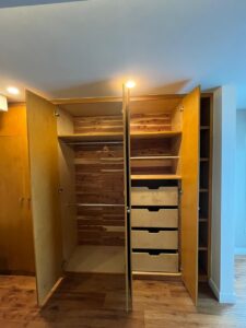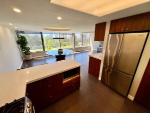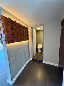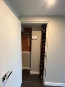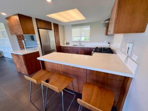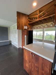 - 🍷 Barra de cuarzo con 3 bancos + mueble para vinos
